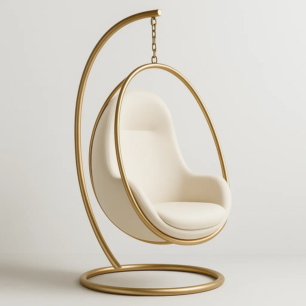 Poltrona sospesa sospesa in metallo dorato e similpelle bianca