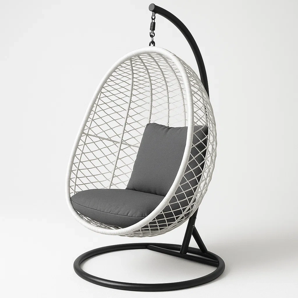 Poltrona sospesa ovale in metallo e rattan con cuscini grigi
