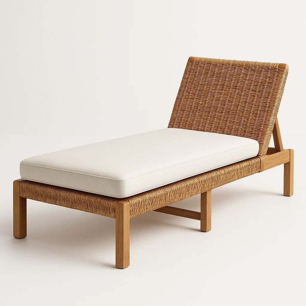 Principali Materiali: Struttura in legno massello con rattan intrecciato, cuscino in poliestere