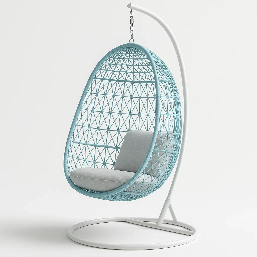La sedia sospesa è realizzata con una struttura in metallo e rivestita in rattan sintetico. Il cuscino è in poliestere.