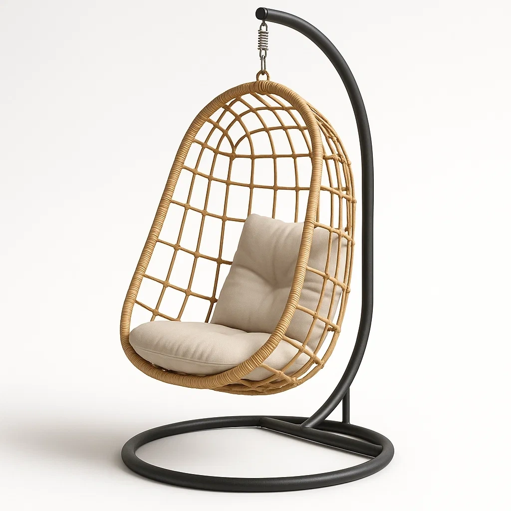 Poltrona sospesa in rattan e acciaio con cuscino beige